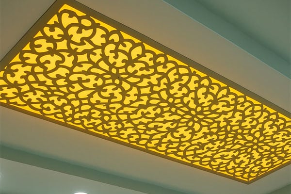 تفاوت اصلی سقف معرق با سقفهای معمولی در طراحی و نوع ساختار آن نهفته است. سقفهای معمولی اغلب ساده و بدون نقش هستند و تنها وظیفه پوشش یا عایق را دارند؛ اما سقف معرق علاوهبر اینکه نقش پوشاننده دارد، بهصورت هنرمندانه طراحی شده و با نور ترکیب میشود. در سقف کاذب معرق، برشهای دقیق با دستگاه CNC انجام میشود و شکلهای هندسی یا طبیعی روی صفحات مختلف حک میشوند.
